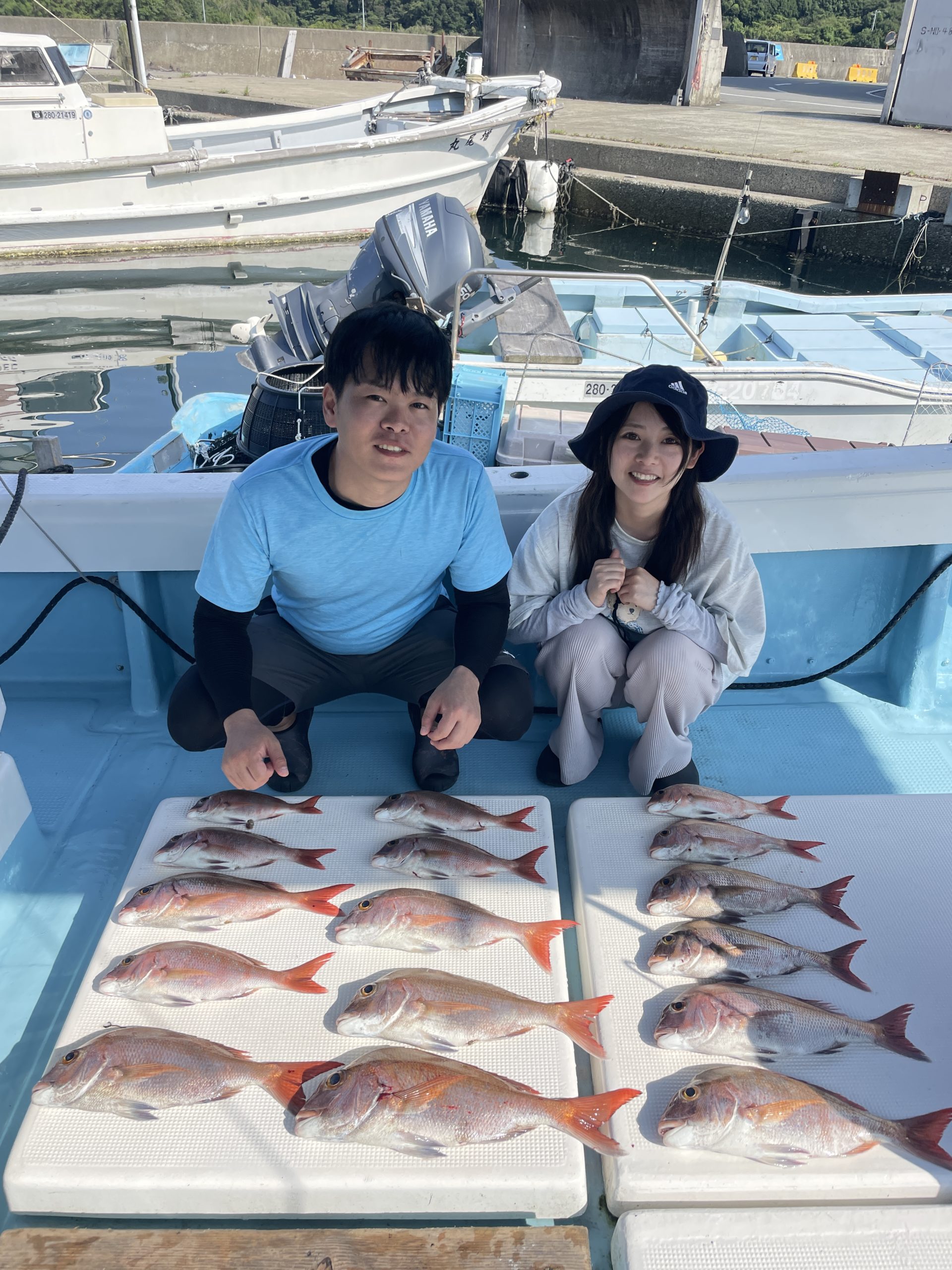 今週は中々渋い日が続きました。魚探に反応があっても当たりがなく移動移動で釣りをしました。深場、磯近くを攻めて渋いながらも数、良型もボチボチ釣れて良かったです。釣り初めての方も全員鯛が釣れて良かったです。