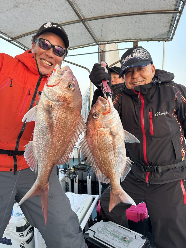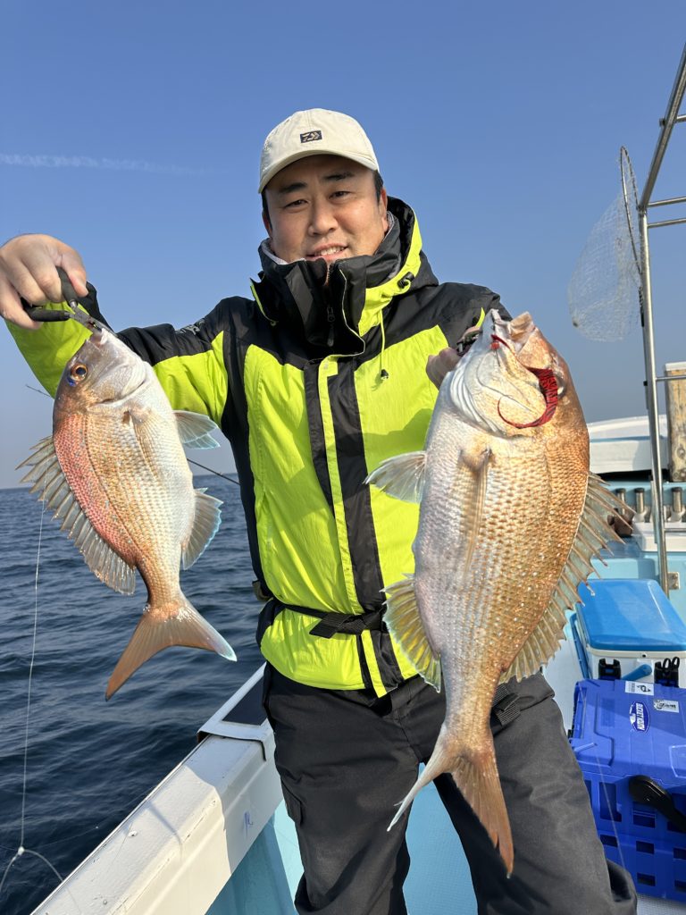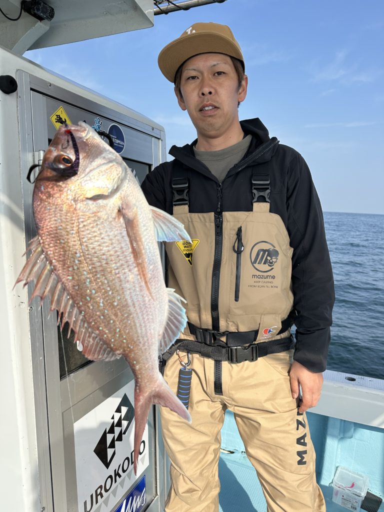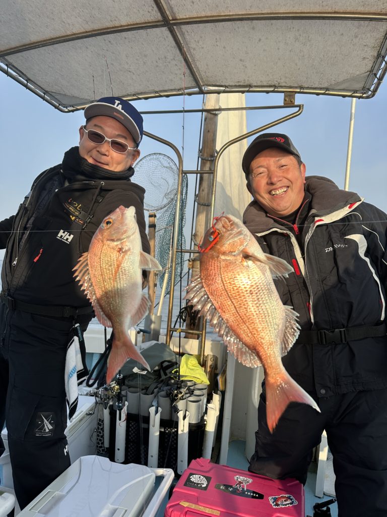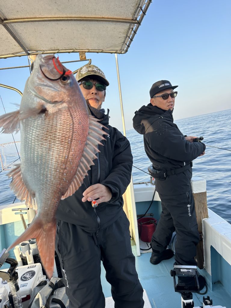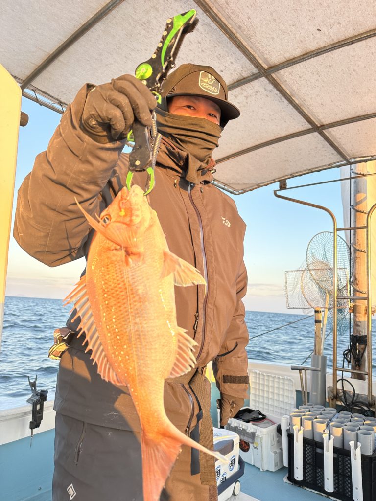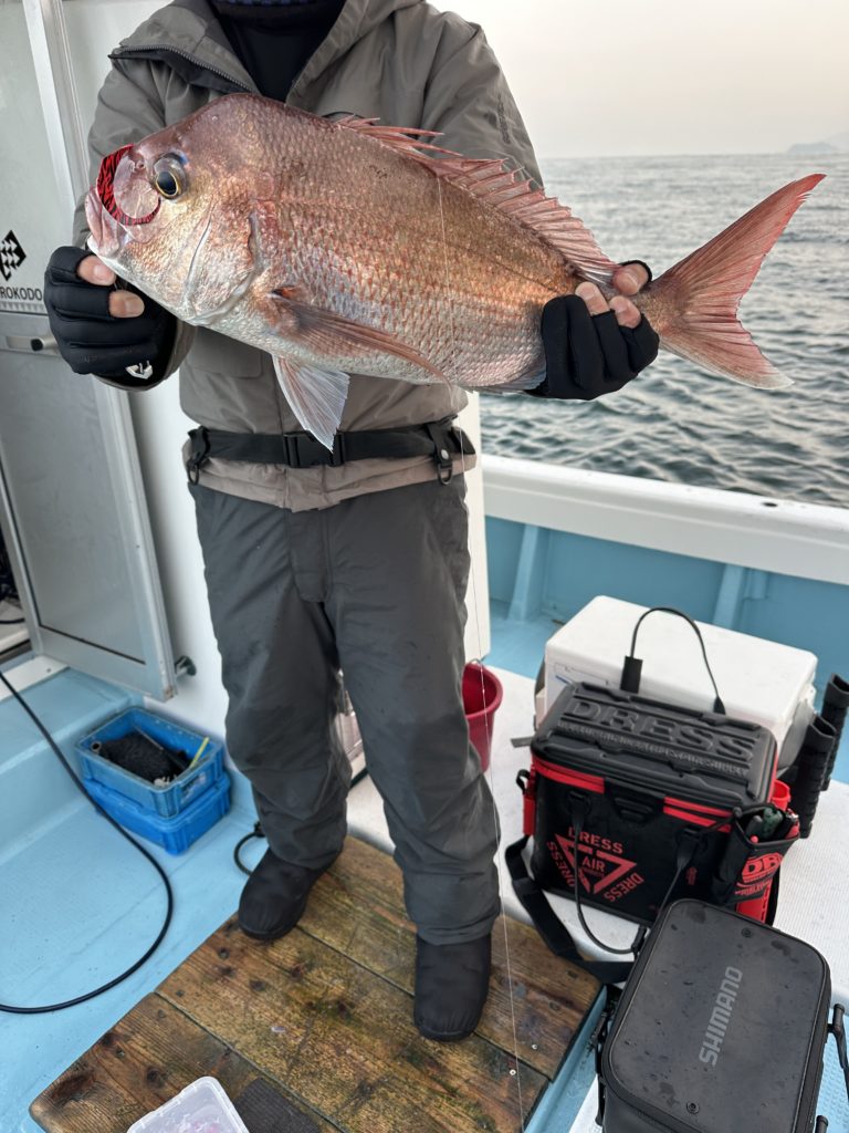 タイラバ、Hタイラバでは当たりも良くあり、浮いた鯛もタイラバによく当たりがありました。水温も11℃と下がり浮いた鯛がタイラバで釣れるとサイズも良く50.60㌢と良型が連発で釣れました。丸々してアメ色に輝いた黄金真鯛も釣れてますので皆さん黄金真鯛を狙いに来て下さい。