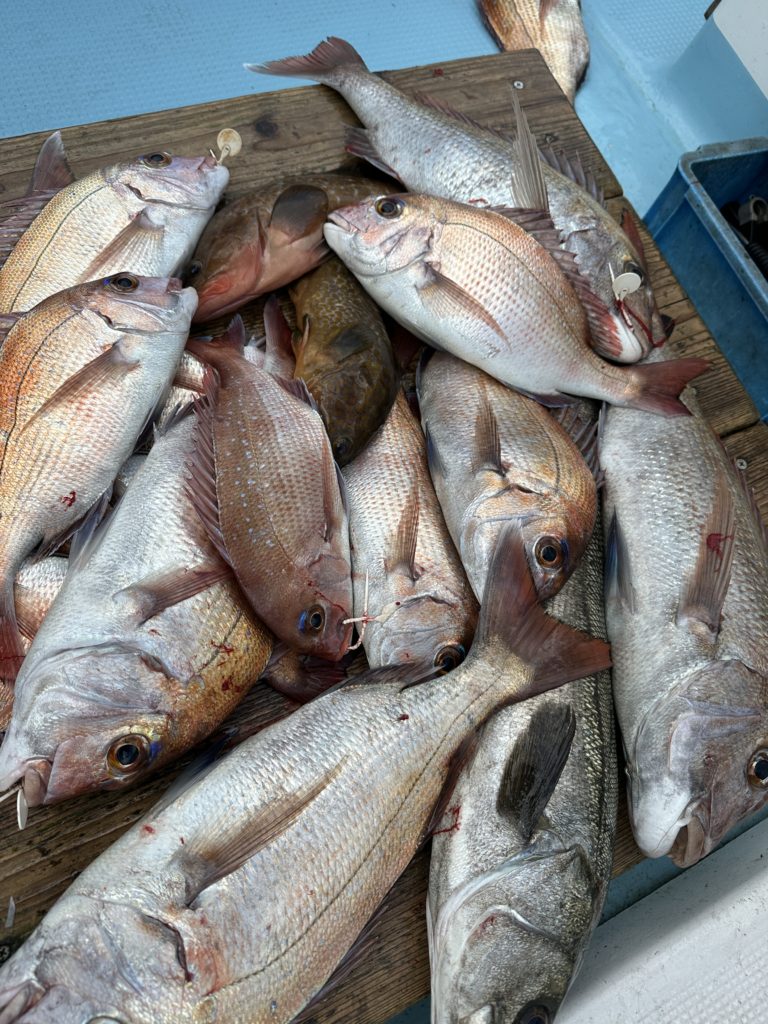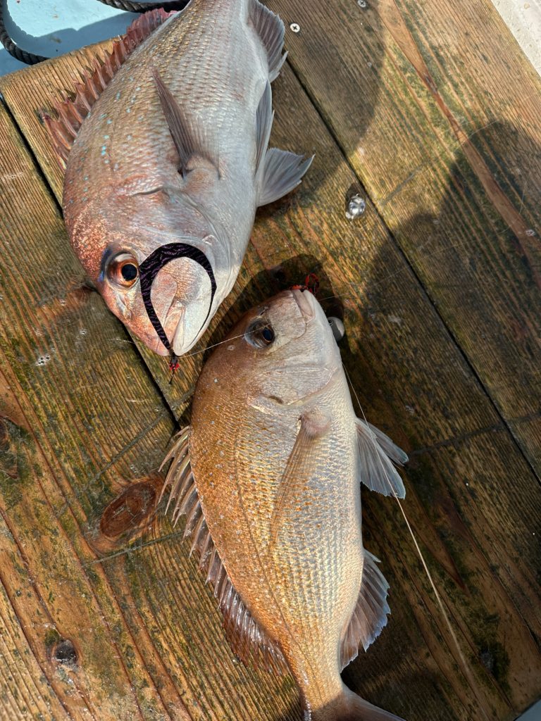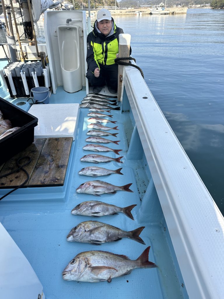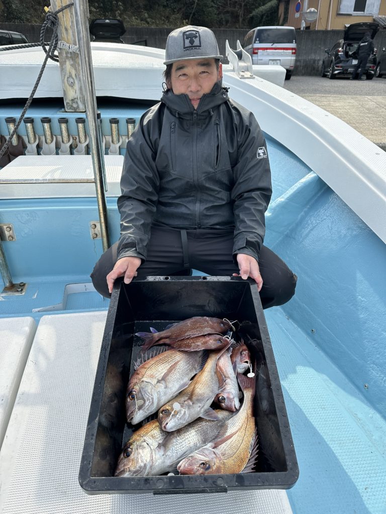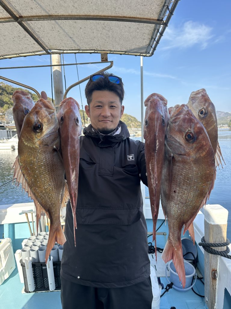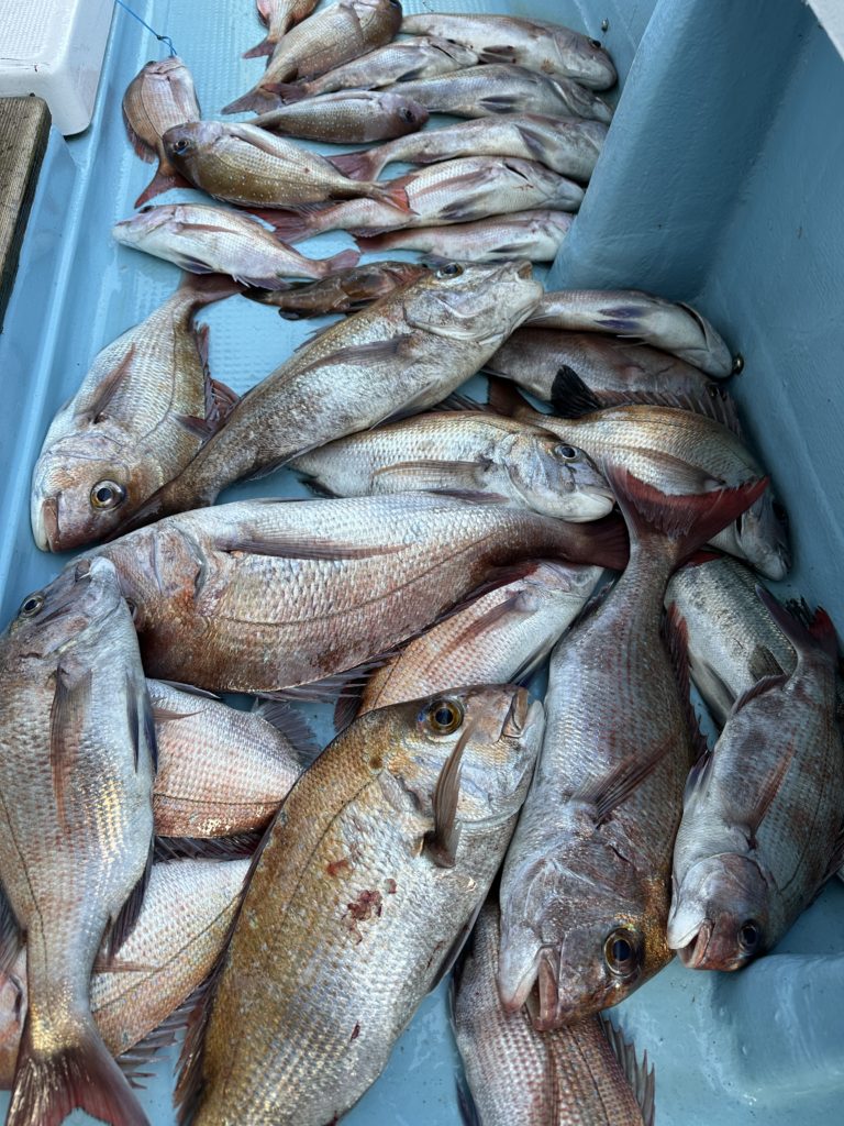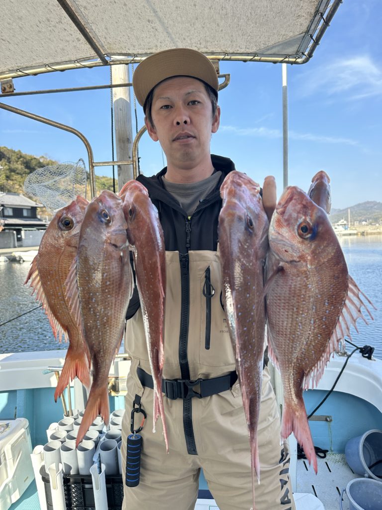 タイラバ、Hタイラバでは当たりも良くあり、浮いた鯛もタイラバによく当たりがありました。水温も11℃と下がり浮いた鯛がタイラバで釣れるとサイズも良く50.60㌢と良型が連発で釣れました。丸々してアメ色に輝いた黄金真鯛も釣れてますので皆さん黄金真鯛を狙いに来て下さい。