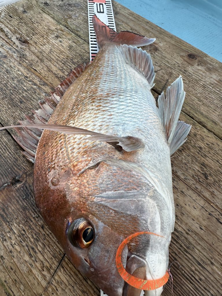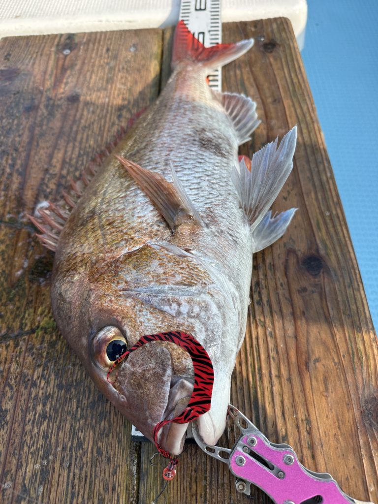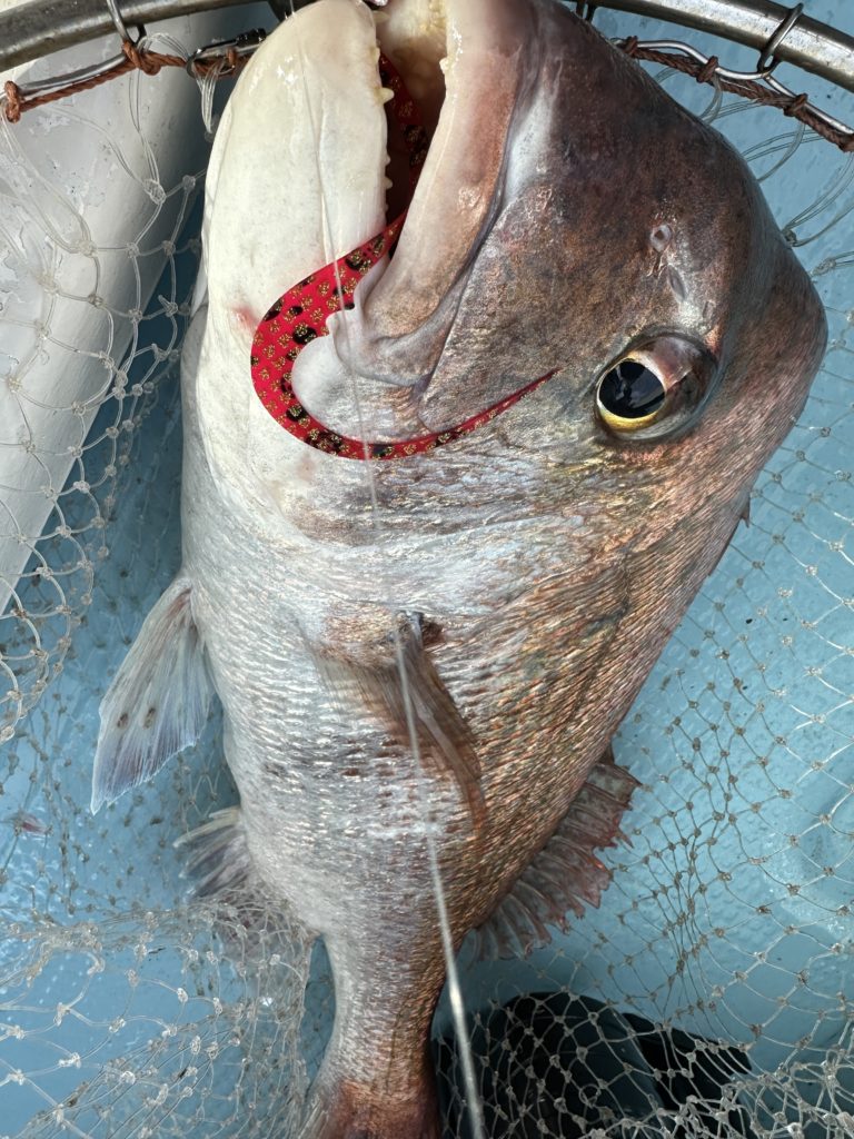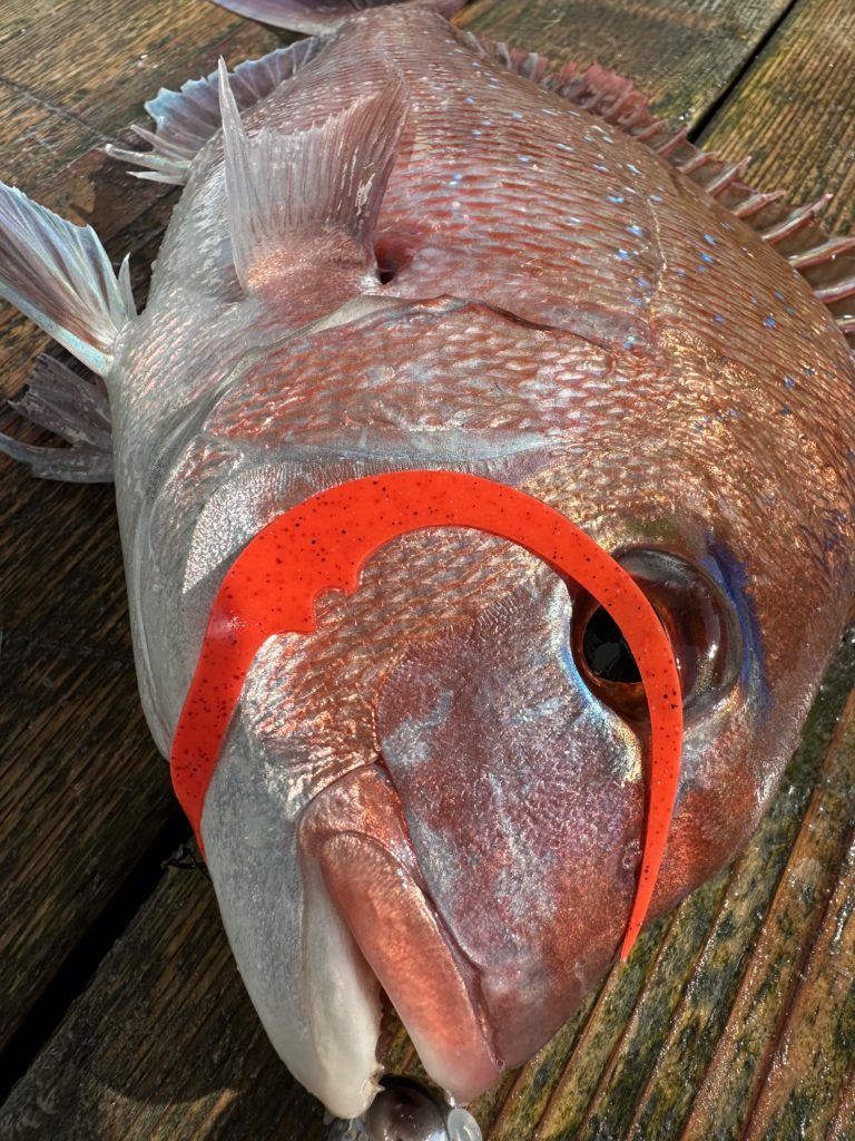 鳴門海峡ではこの時期、水温が下がることで潮流が複雑かつ速くなり、底に留まれなくなった鯛が中層〜上層に浮いてきます。そのため、狙いが定まりにくく釣りが難しくなりますが、海遊さんオリジナルネクタイ、ヘラクレス、サウザー、シングルカーリーで50㌢UPを連発で釣って頂きました。ありがとうございました。