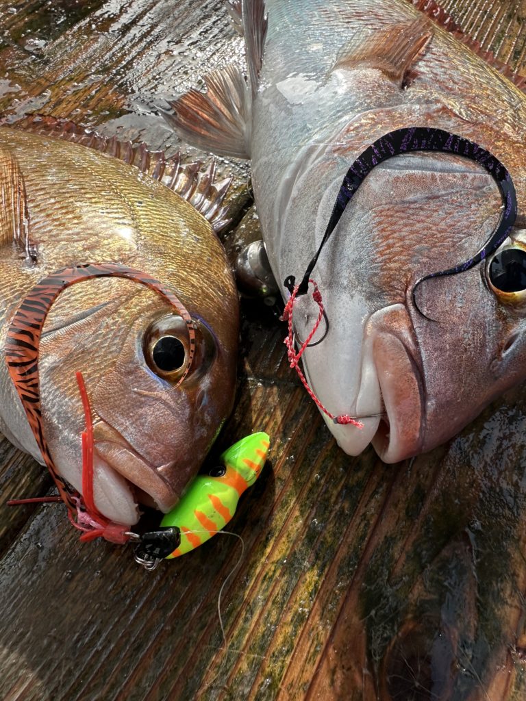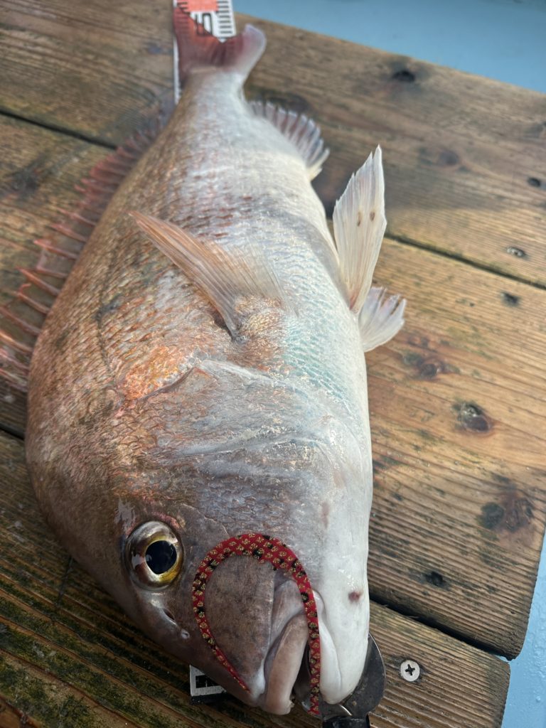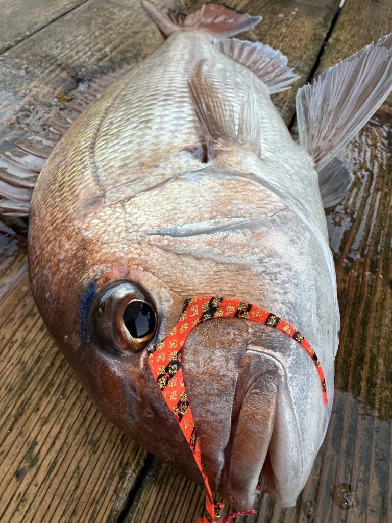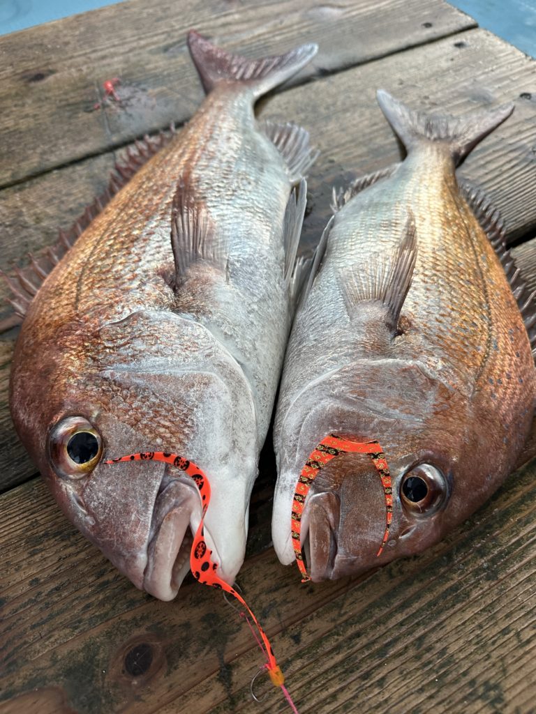 鳴門海峡ではこの時期、水温が下がることで潮流が複雑かつ速くなり、底に留まれなくなった鯛が中層〜上層に浮いてきます。そのため、狙いが定まりにくく釣りが難しくなりますが、海遊さんオリジナルネクタイ、ヘラクレス、サウザー、シングルカーリーで50㌢UPを連発で釣って頂きました。ありがとうございました。